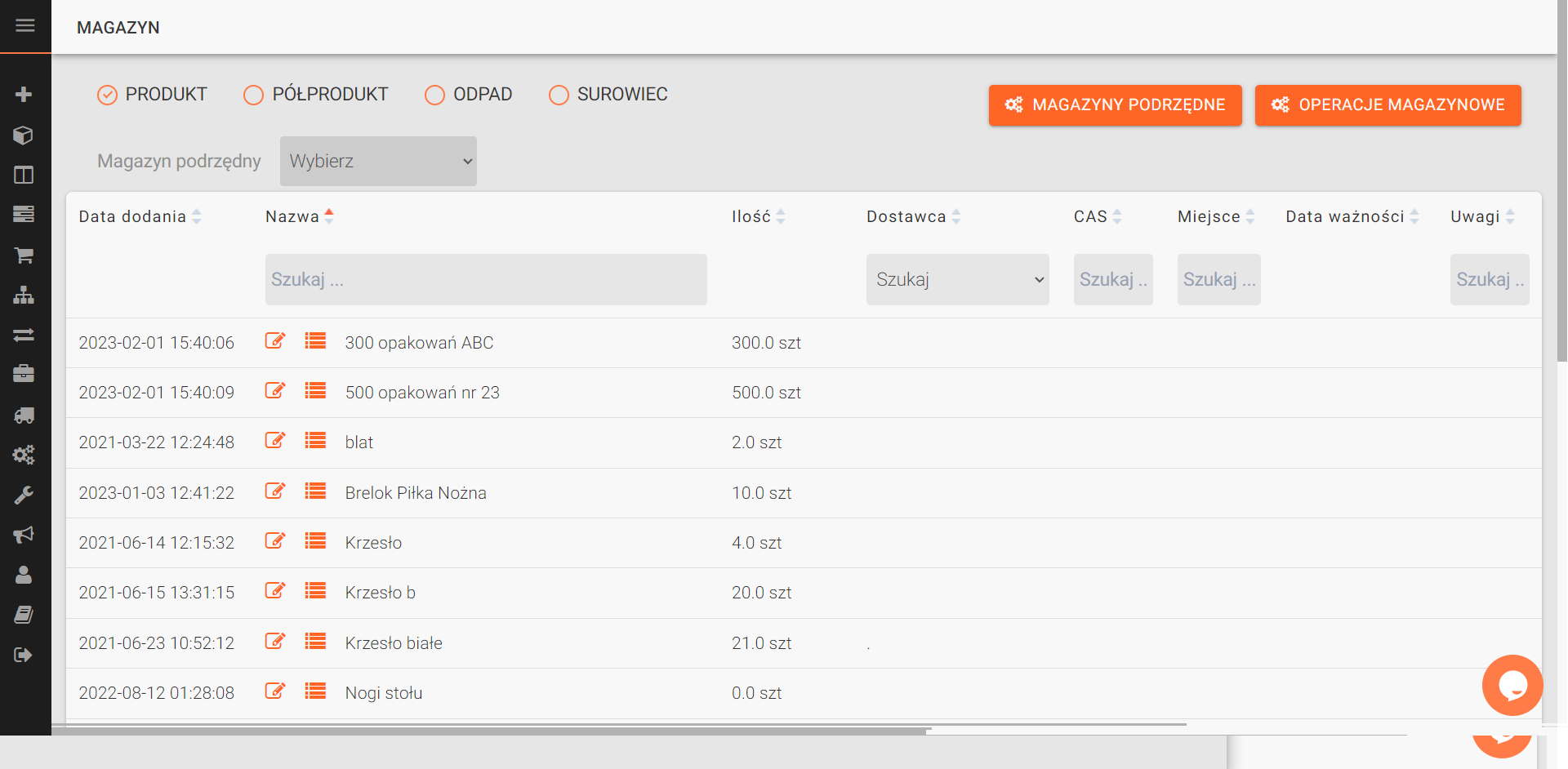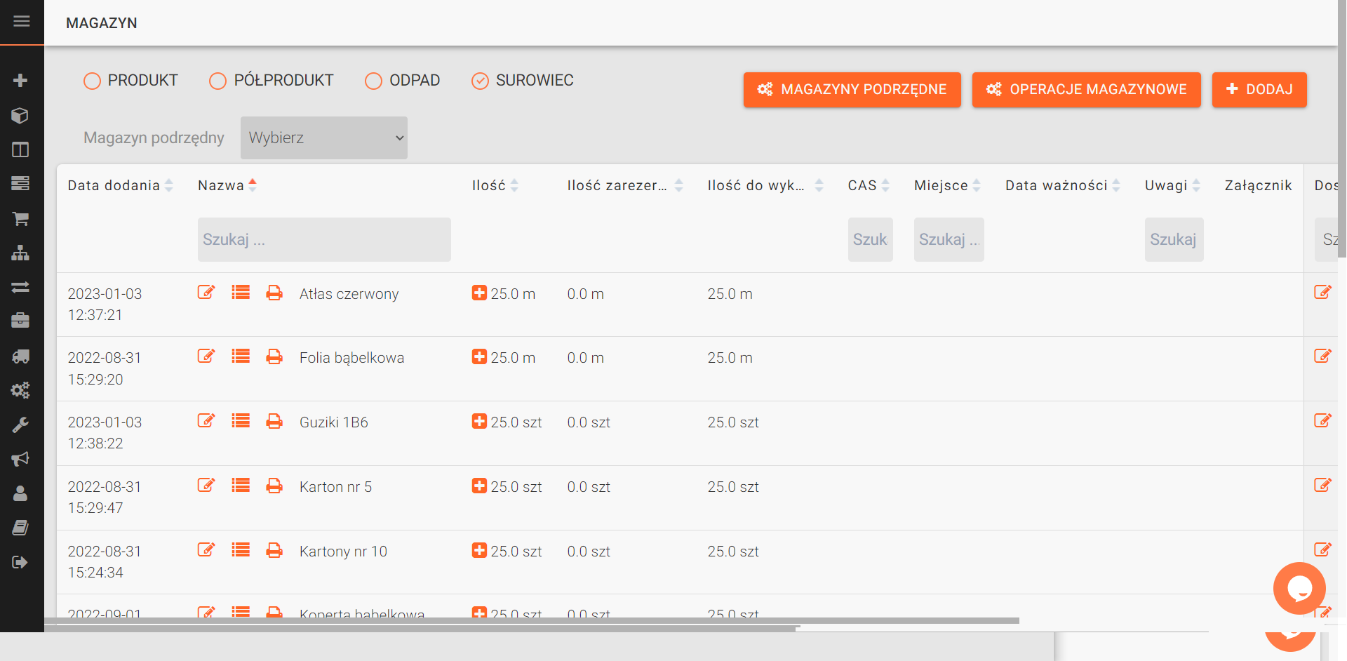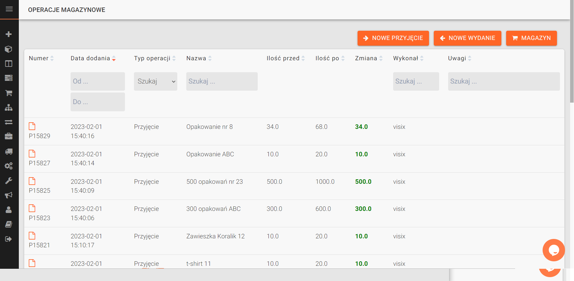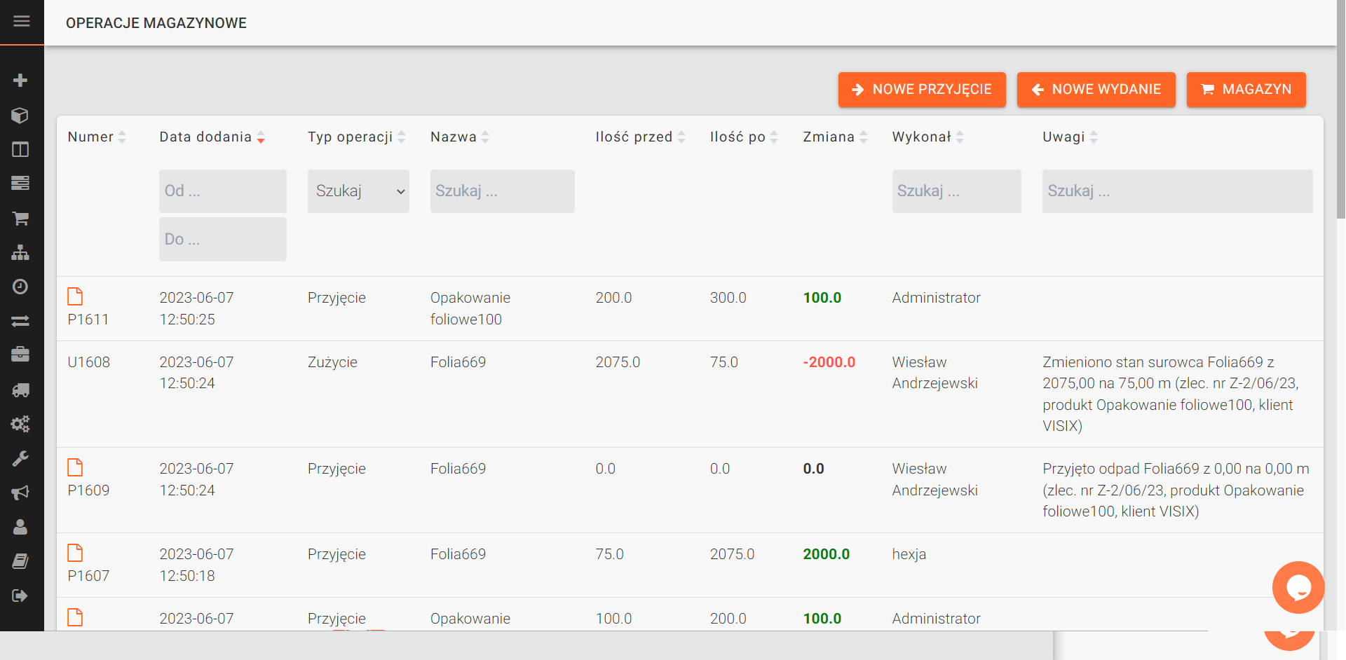 Wszystkie zmiany i przesunięcia dotyczące stanów magazynowych rejestrowane są automatycznie w zakładce Operacje magazynowe. Każde wydanie i przyjęcie z magazynu zostanie odnotowane. W historii operacji znajdziemy też informacje o zużyciu danego surowca, na jakie zlecenie zostało wykorzystane i przez którego pracownika. Posiadanie historii operacji magazynowych przynosi wiele korzyści dla przedsiębiorstwa, np. śledzenie stanów magazynowych, utrzymywanie dokładnych rekordów, analiza wydajności magazynu, kontrola jakości towarów oraz optymalizacja procesów magazynowych.
