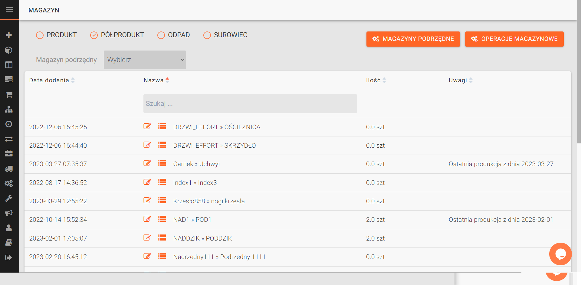 Magazyn półproduktów zawiera informacje o elementach stanowiących część/podelement wyrobu gotowego. Zapoznając się ze stanem magazynowym półproduktów, widać od razu, jakiego produktu dotyczy dany podelement.