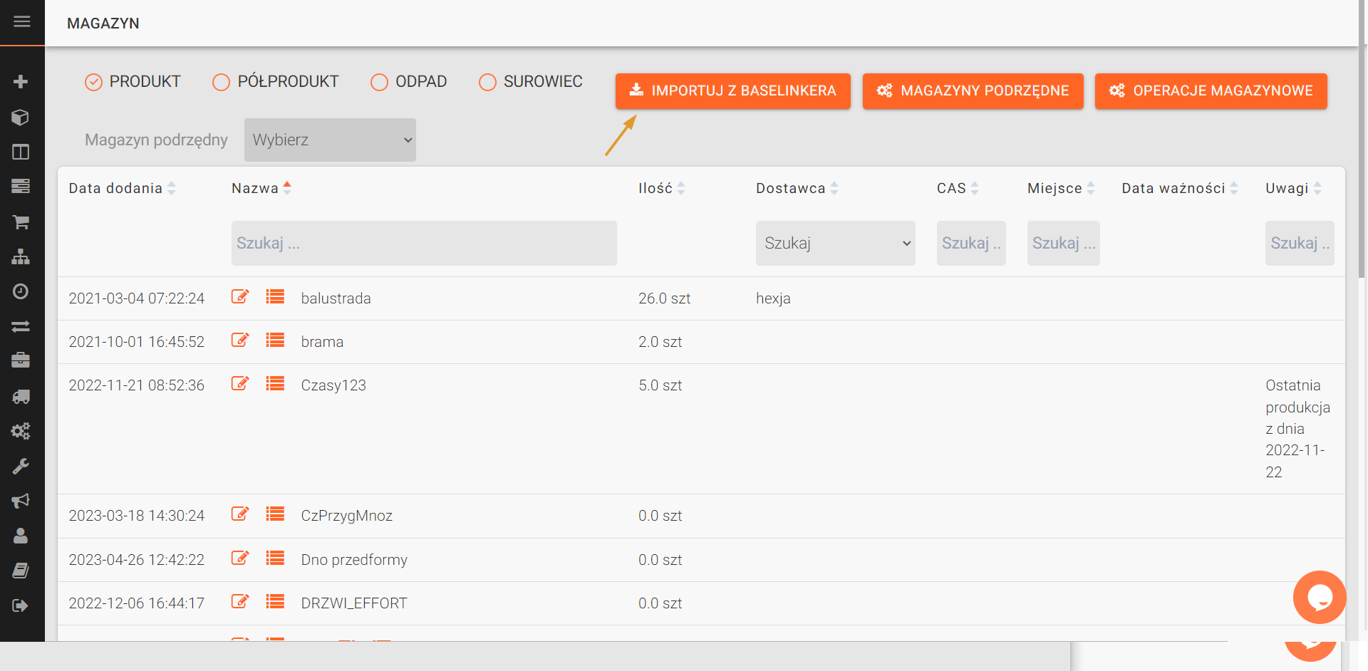 W zakładce magazyn jest możliwość zaktualizowania stanów magazynowych produktów firmy po sprzedaży w sklepie internetowym. Dzięki jednemu kliknięciu opcji “Importuj z Baselinkera” możliwa jest synchronizacja danych. Dzięki temu przedsiębiorstwo może uniknąć sytuacji, w których sprzedaje produkty już wcześniej zarezerwowane lub wykorzystane w produkcji. Pozwala to na lepszą kontrolę nad stanami magazynowymi i uniknięcie niepotrzebnych niedoborów.
