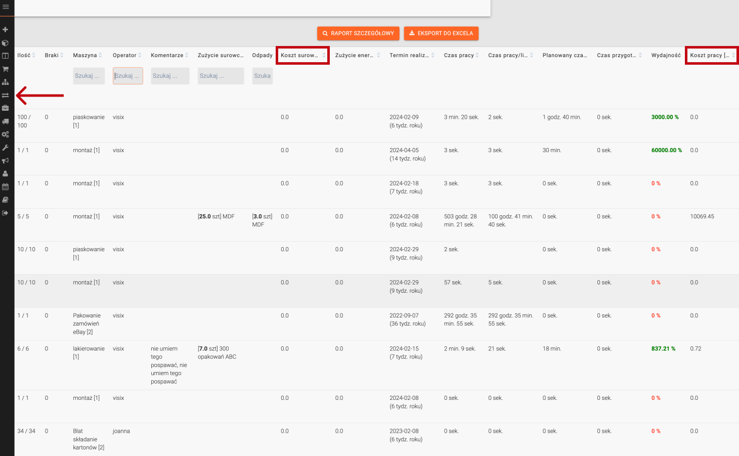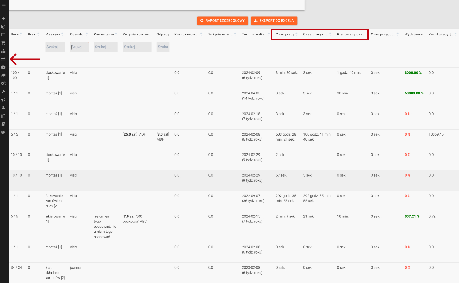Czas pracy można sprawdzić w zakładce „Raport produkcji” w kolumnach „czas pracy”, „czas pracy/liczba sztuk” oraz „planowany czas pracy”. Funkcja umożliwia precyzyjne monitorowanie czasu pracy, co jest kluczowe dla efektywnego zarządzania zasobami ludzkimi i maszynowymi. Dzięki szczegółowym danym menedżerowie mogą lepiej planować harmonogramy, unikać przeciążeń pracowników i maszyn oraz optymalizować procesy produkcyjne.