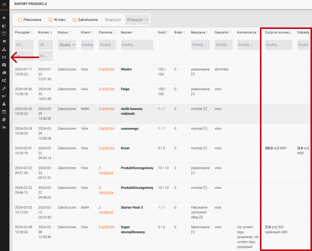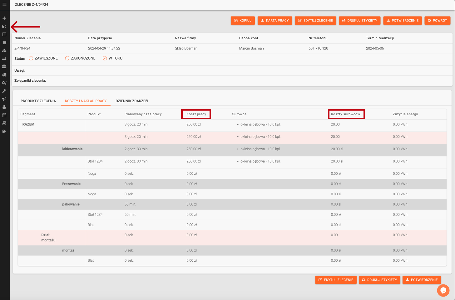 Koszt surowców i koszt pracy można sprawdzić w zakładce „Zlecenia produkcyjne” klikając w poszczególne zlecenia. Funkcja ta jest niezwykle przydatna, ponieważ umożliwia dokładne monitorowanie i kontrolowanie kosztów produkcji. Dzięki niej menedżerowie mogą szybko zidentyfikować, gdzie pojawiają się największe koszty i podjąć działania w celu ich optymalizacji. Dokładna analiza kosztów surowców i pracy pozwala na bardziej precyzyjne planowanie budżetu oraz poprawę rentowności projektów.