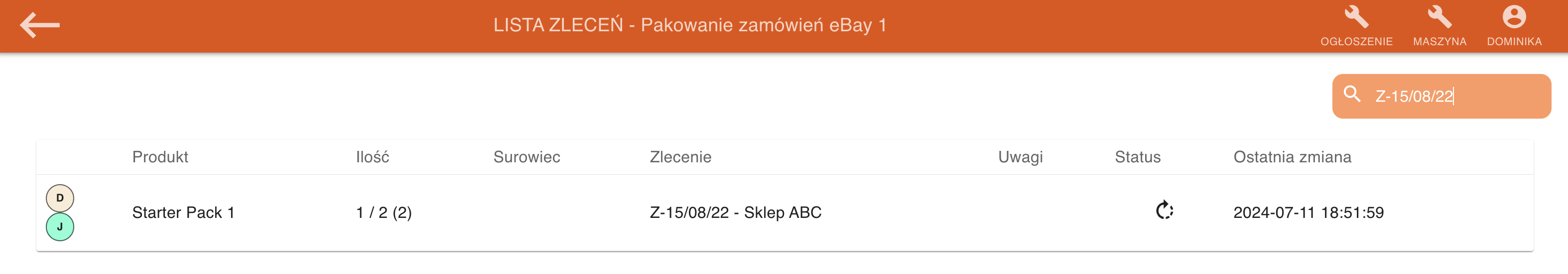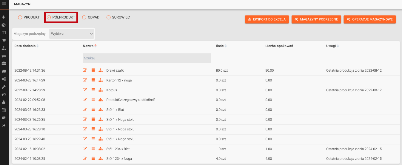 W zakładce „Magazyn” znajduje się kategoria „Półprodukt”, która zawiera wszystkie informacje na temat półproduktów. Obejmuje ona części/podelementy wyrobu gotowego, a dane są aktualizowane na bieżąco wraz z postępem realizacji zleceń. Zapoznając się ze stanem magazynowym półproduktów, można sprawdzić, do którego produktu należy dany podelement. Możliwa jest również filtracja półproduktów według poszczególnych kryteriów, co ułatwia proces ich wyszukiwania.
