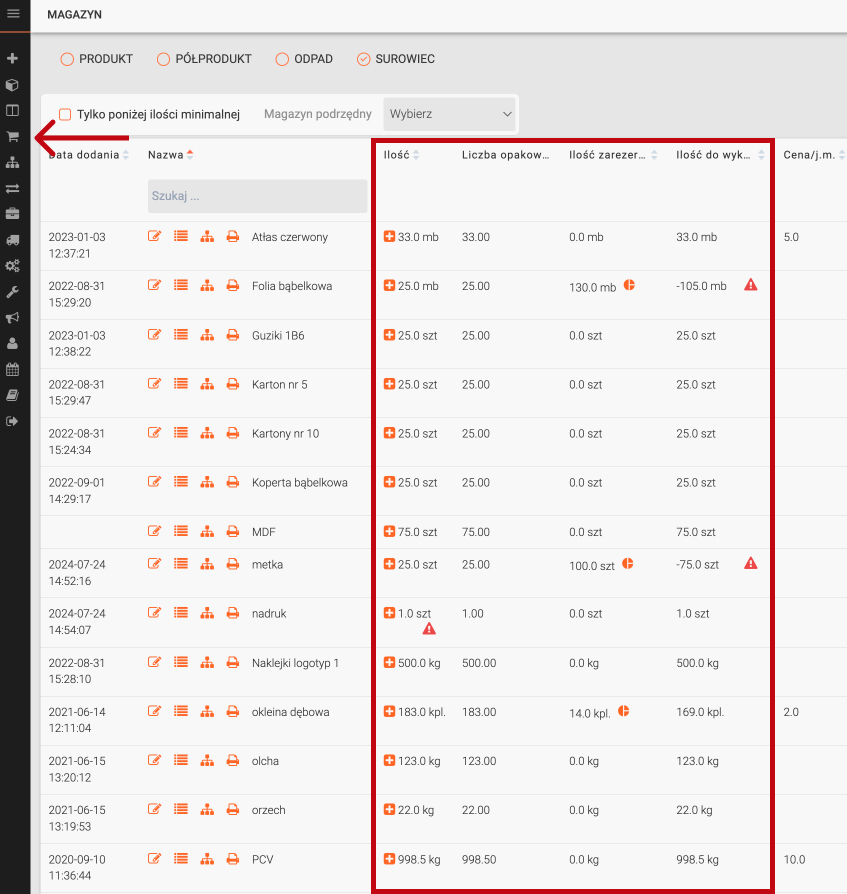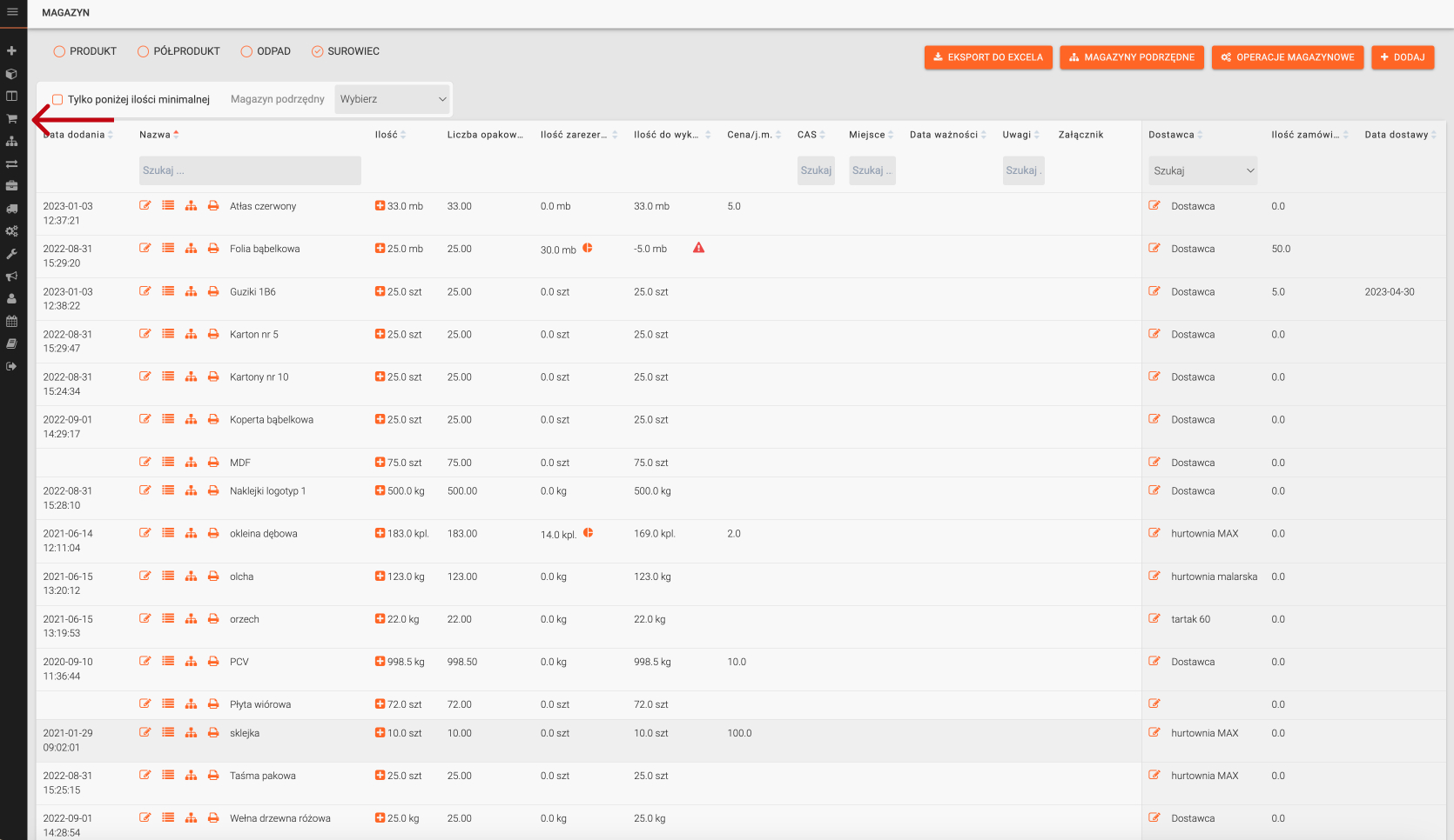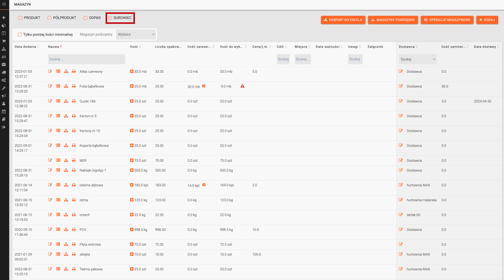 W zakładce „Magazyn” znajduje się kategoria „Surowiec”, która zawiera zestawienie na temat stanów magazynowych materiałów używanych do produkcji półproduktów i produktów. Możliwa jest filtracja surowców według poszczególnych kryteriów, co ułatwia proces ich wyszukiwania.