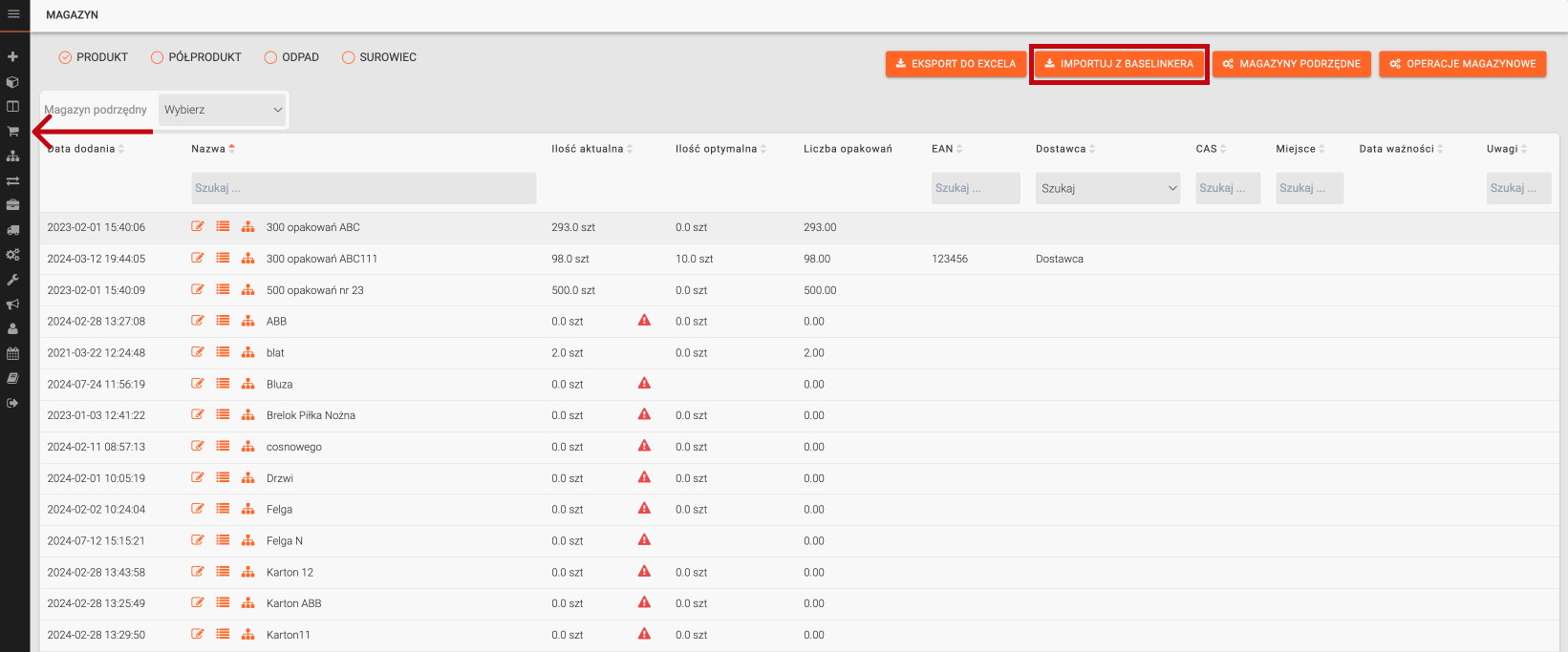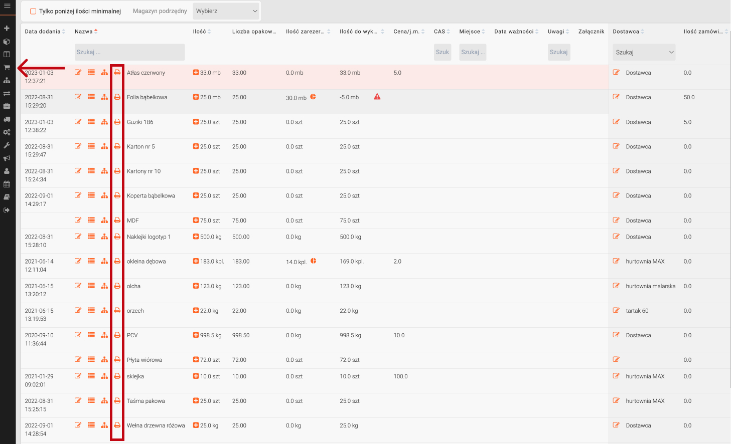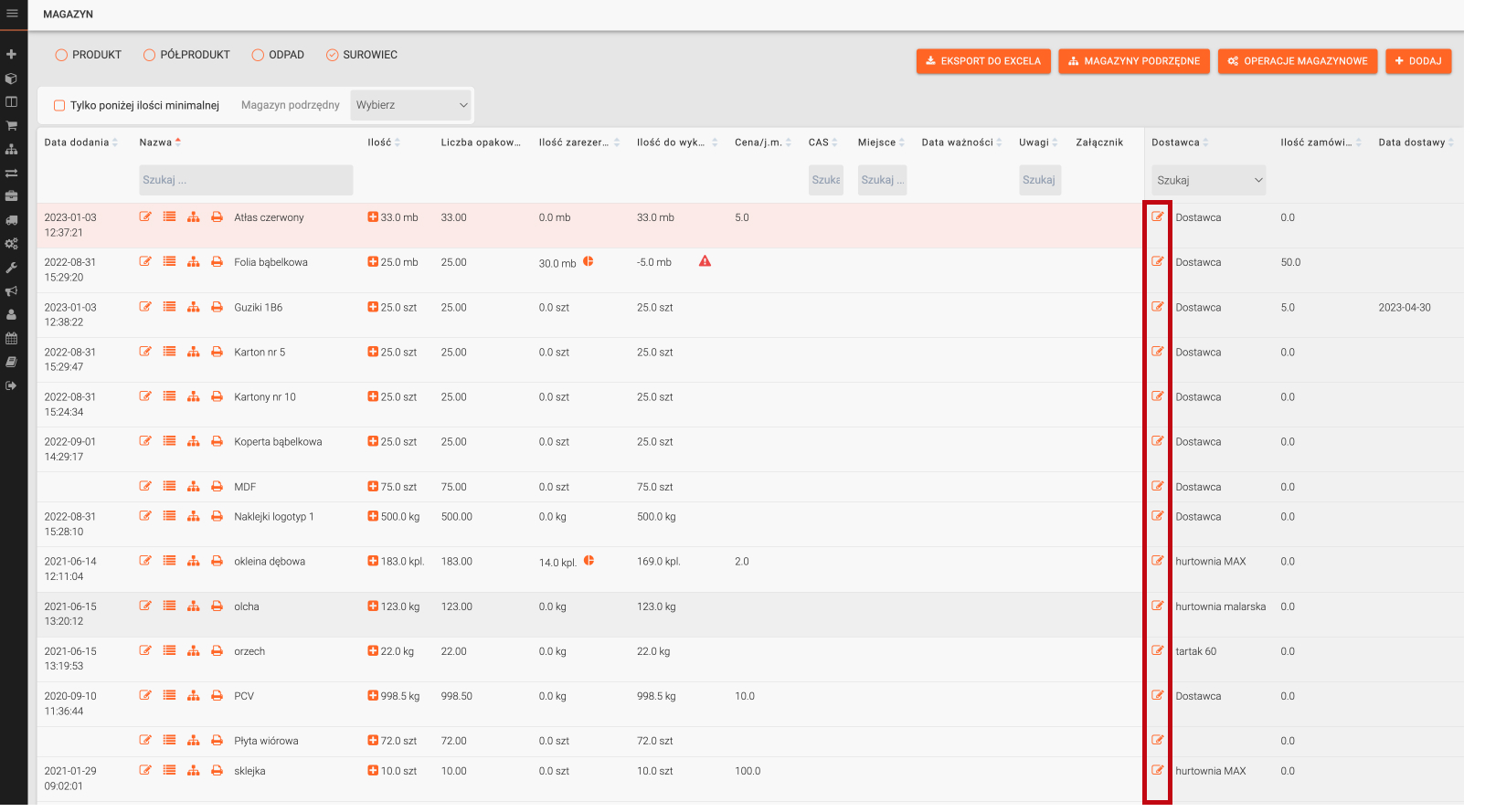 W zakładce „Magazyn” znajduje się kategoria „Surowiec”, która zawiera zestawienie na temat stanów magazynowych materiałów używanych do produkcji półproduktów i produktów. Możliwa jest filtracja surowców według poszczególnych kryteriów, co ułatwia proces ich wyszukiwania.