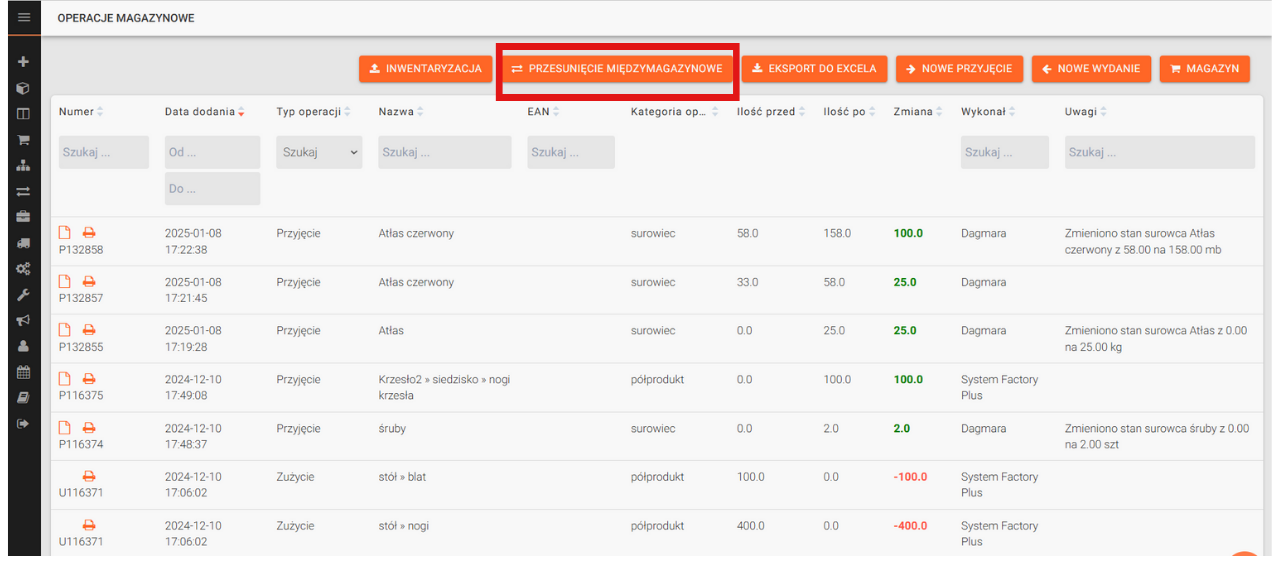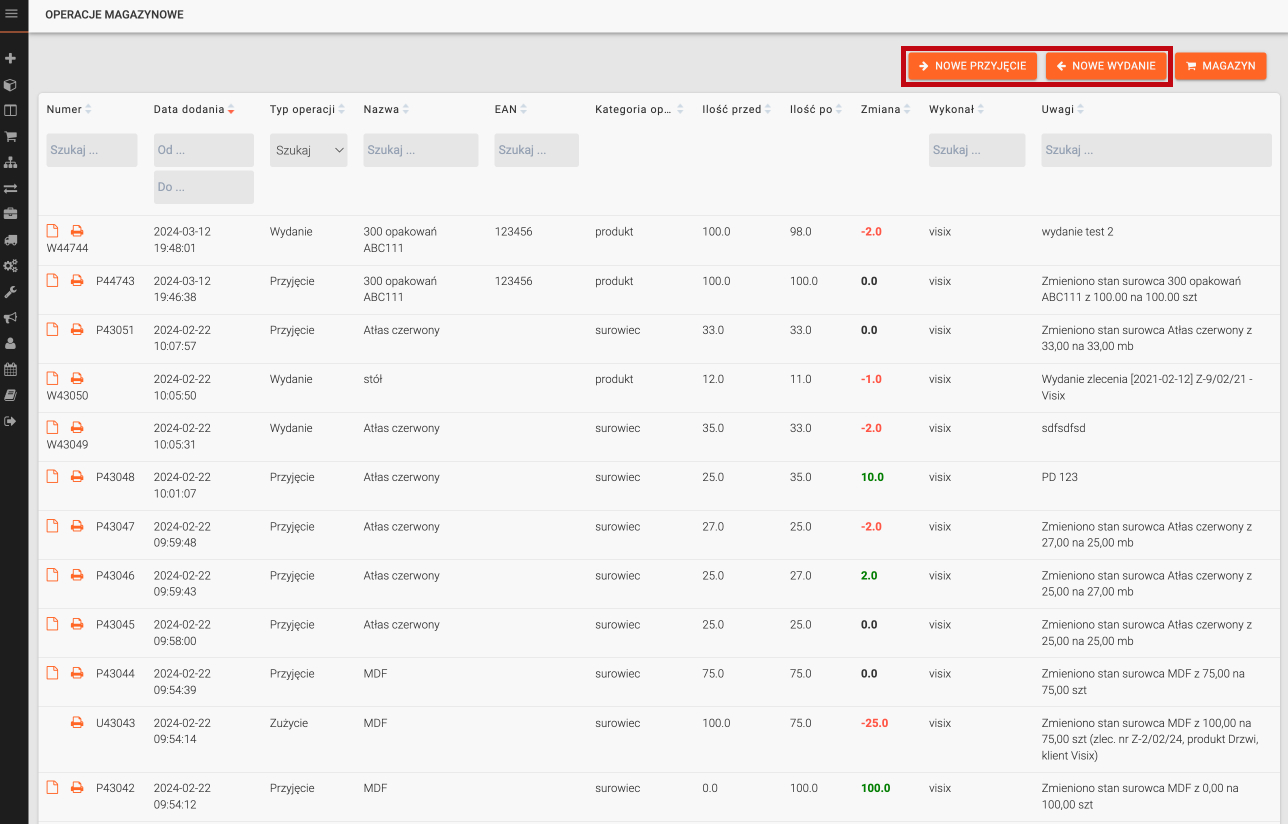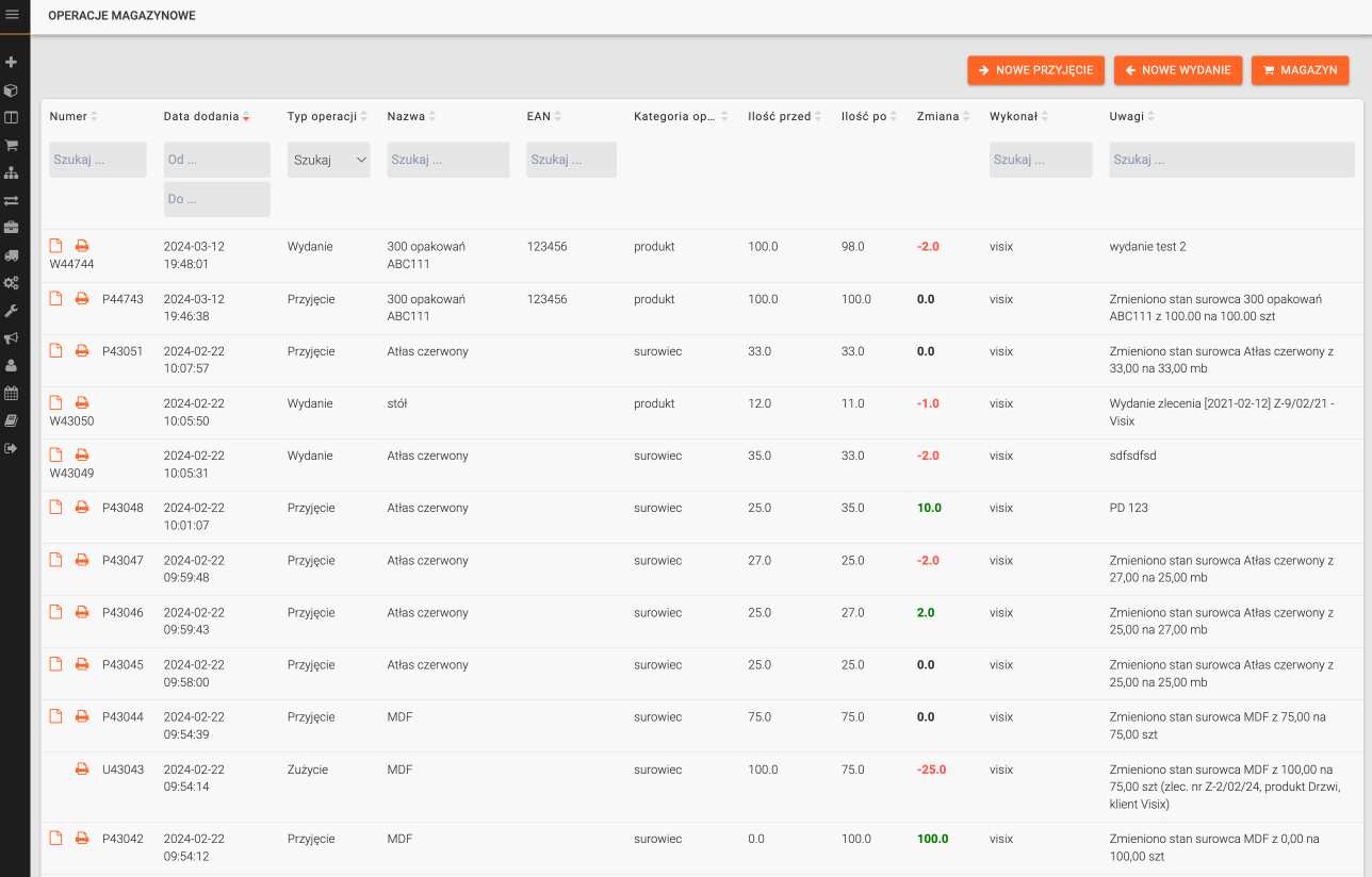Funkcja „Operacje magazynowe”, pozwala na rejestrowanie wszystkich operacji magazynowych. Z łatwością można zarejestrować „Nowe przyjęcie” oraz „Nowe wydanie” klikając odpowiednie przyciski. Funkcja umożliwia precyzyjne śledzenie ruchów magazynowych, co prowadzi do lepszej kontroli nad stanami magazynowymi. Dzięki temu menedżerowie mogą na bieżąco monitorować dostępność surowców i produktów, co z kolei pozwala na szybkie reagowanie na ewentualne niedobory lub nadwyżki.