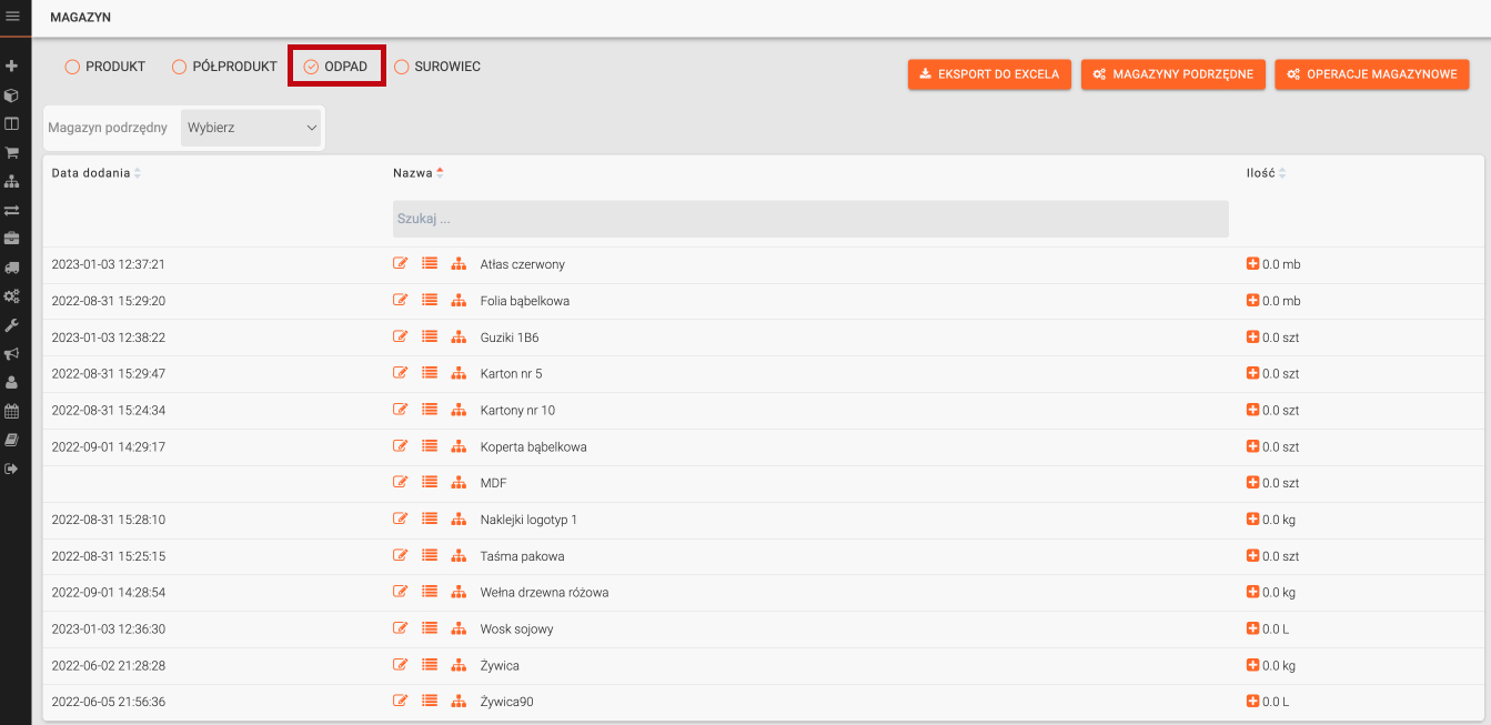 W zakładce „Magazyn” znajduje się kategoria „Odpad”, która zawiera wszystkie informacje na temat odpadów powstałych w wyniku procesów produkcyjnych. Informacje o odpadach są automatycznie aktualizowane wraz z postępem zleceń, na podstawie danych wprowadzanych przez pracowników na hali produkcyjnej. Możliwa jest również filtracja odpadów według ich nazwy, co ułatwia proces ich wyszukiwania.