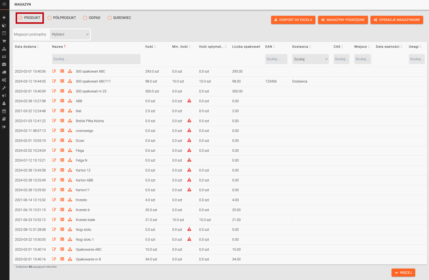 W zakładce „Magazyn” znajduje się kategoria „Produkt”, która zawiera wszystkie informacje na temat produktów. Obejmuje ona wyroby gotowe, które powstały w procesie produkcji, a dane są aktualizowane na bieżąco wraz z postępem realizacji zleceń. Możliwa jest filtracja produktów według poszczególnych kryteriów, co ułatwia proces ich wyszukiwania.