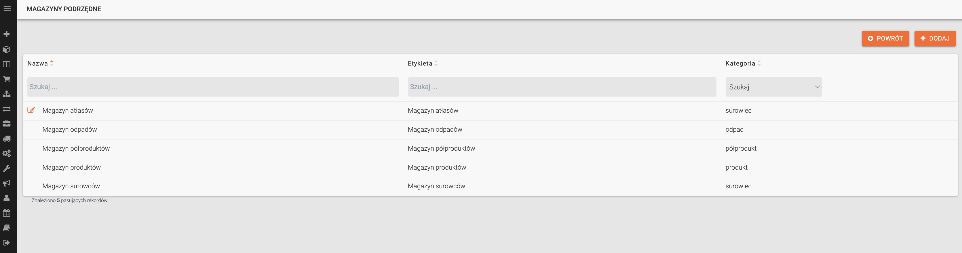 Zakładka Magazyn zawiera informacje o produktach, półproduktach, odpadach oraz surowcach, które można filtrować według wymienionych kategorii. Ten podział pomaga w lepszej organizacji magazynu, łatwiejszej kontroli stanów magazynowych, poprawie wydajności procesu produkcyjnego, łatwiejszym zarządzaniu odpadami oraz optymalizacji procesów produkcyjnych. Magazyn pozwala na zebranie wszelkich informacji o zasobach do produkcji, co przynosi wiele korzyści dla przedsiębiorstwa. Zarządzanie magazynem staje się bardziej efektywne i zorganizowane, co przekłada się na lepsze wykorzystanie zasobów, redukcję kosztów oraz poprawę jakości produkcji.