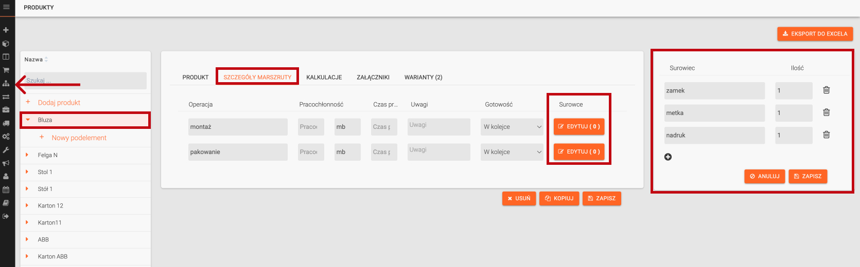 W zakładce „Produkty”, wybierając jeden z produktów oraz przechodząc do „Szczegółów marszruty”, znajdziemy pole do edycji „Surowce”, w którym można dodać materiały potrzebne do każdej operacji. Uzupełniając listę surowców, tworzymy recepturę wykonania danej operacji. Główną zaletą tej funkcji jest przede wszystkim lepsza kontrola nad zużyciem materiałów, co przekłada się na efektywne zarządzanie zasobami i minimalizację braków. Bieżące monitorowanie stanów magazynowych ułatwia planowanie i unikanie opóźnień w produkcji.